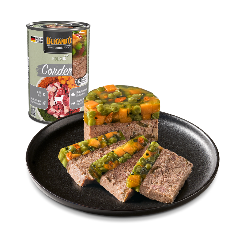 Composición: Carne, corazón, hígado, pulmón y panza de cordero (53 %); caldo de carne de cordero (37,4 %); batata o boniato (3 %); zooplancton marino (krill)*¹ (2,4 %); guisantes (2 %); minerales (1,1 %); bayas de goji*² (0,5 %); cáscaras de huevo*² (0,4 %); algas*² (Chlorella vulgaris) (0,2 %) *¹molido *²secado.