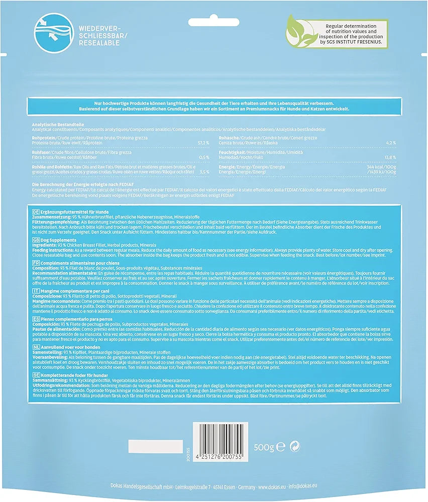 La golosina baja en grasa para todos los amantes de las aves de corral: filete de pechuga de pollo en finas tiras. Secada suavemente al aire y baja en grasa. 100 % filete de pechuga de pollo (referido al contenido de carne).