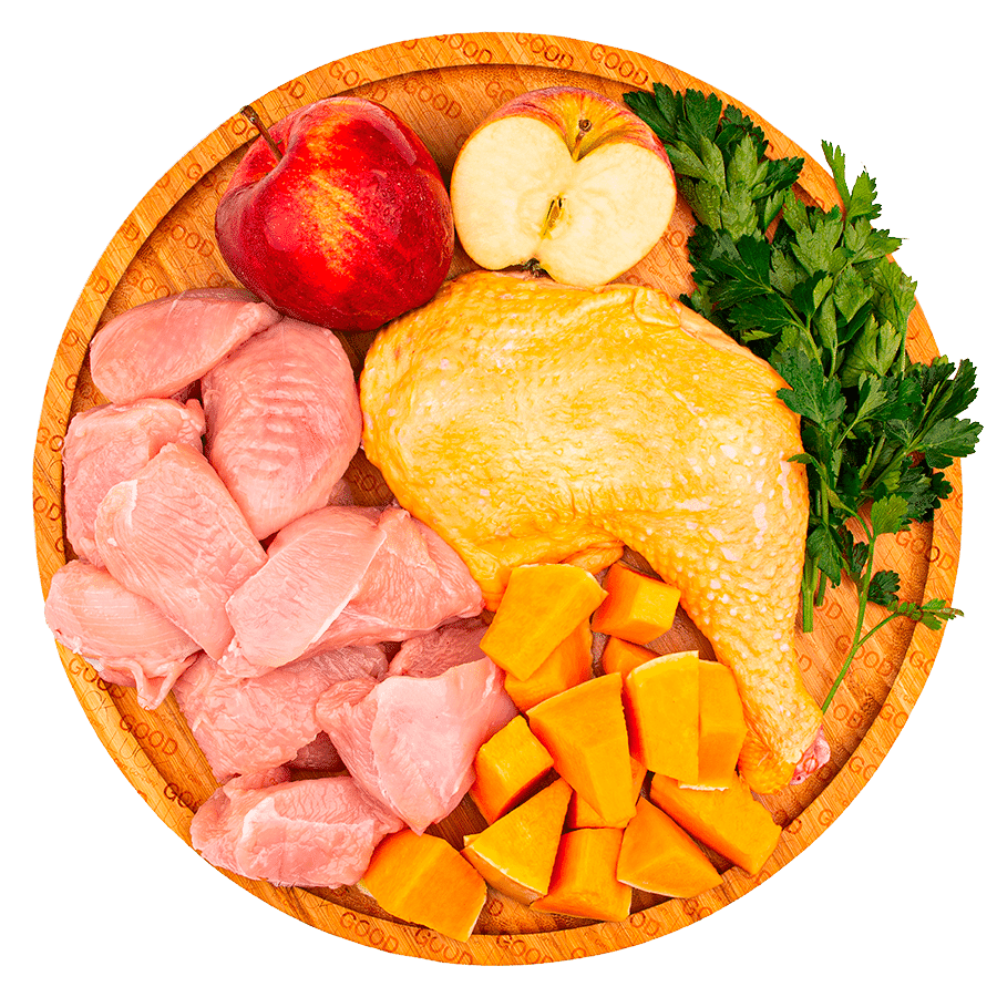 Los Nat’s de aves de granja para perros de Good Luck están elaborados con 40% de pollo, 10% de hígado de pollo, 40% de pavo, 6% de calabaza y 4% de manzana.