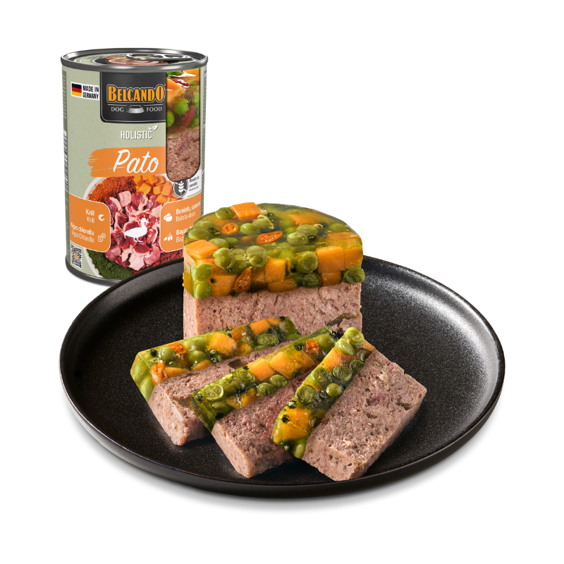 Composición: Carne, mollejas, corazón, y hígado de pato (53 %); caldo de carne de pato (37,5 %); batata o boniato (3 %); zooplancton marino (krill)*¹ (2,4 %); guisantes (2 %); minerales (1,1 %); bayas de goji*² (0,5 %); cáscaras de huevo*² (0,3 %); algas*² (Chlorella vulgaris) (0,2 %) *¹molido *²secado.